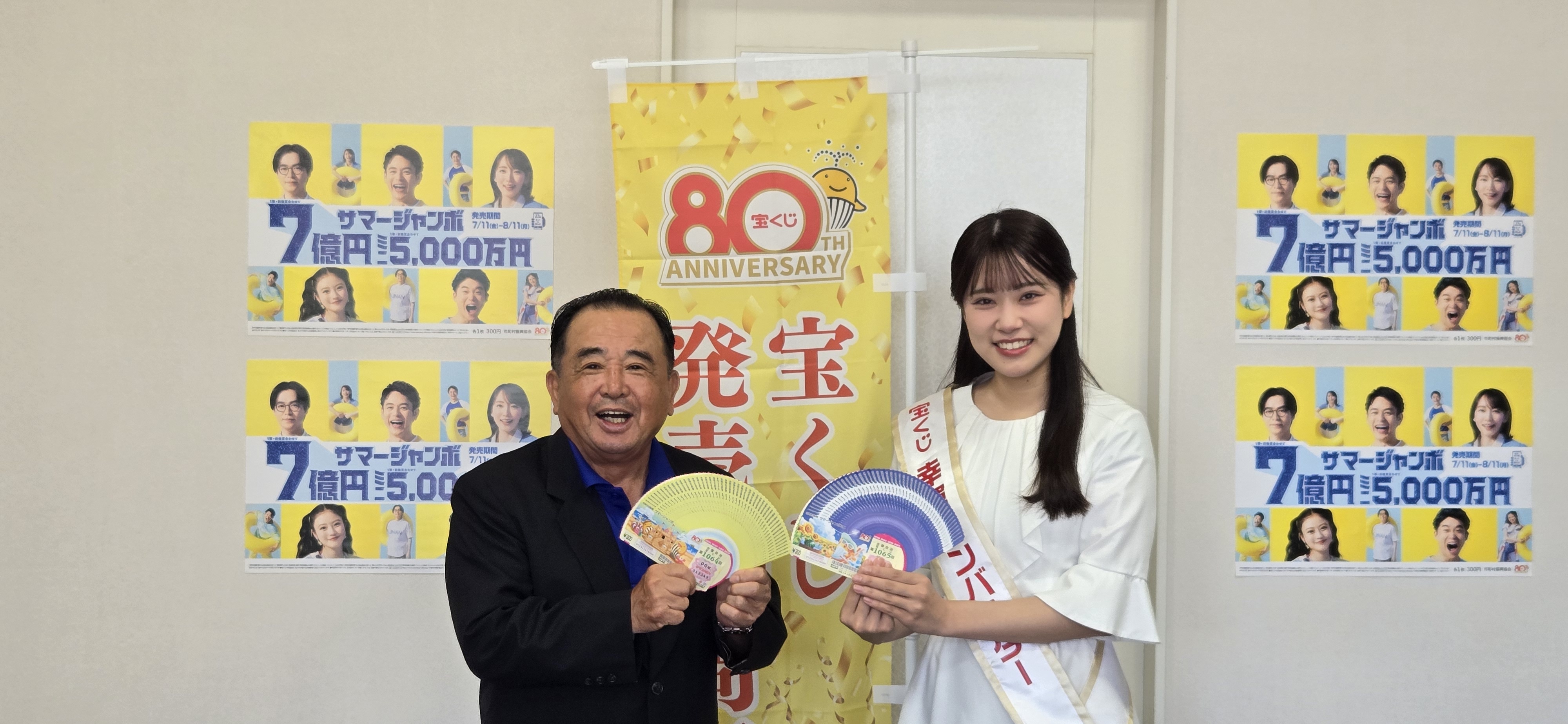 サマージャンボ宝くじとサマージャンボミニのPRのため,宝くじ「幸運アンバサダー」の小野田百合(おのだゆり)さんが公益財団法人鹿児島県市町村振興協会の本坊理事長を表敬訪問されました。