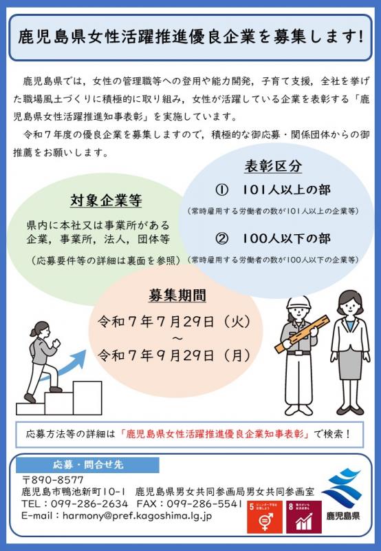 ホーム > くらし・環境 > 人権・男女共同参画 > 女性の活躍推進 > 令和7年度鹿児島県女性活躍推進優良企業を募集します!(終了しました)