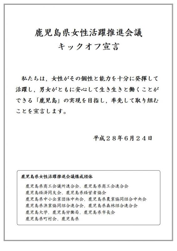 女性がその個性と能力を十分に発揮して活躍し,男女がともに安心して生き生きと働くことができる「鹿児島」の実現を目指し,多様な主体が連携して本県における女性活躍の取組を加速化するため,平成28年6月24日に「鹿児島県女性活躍推進会議」を設立しました。