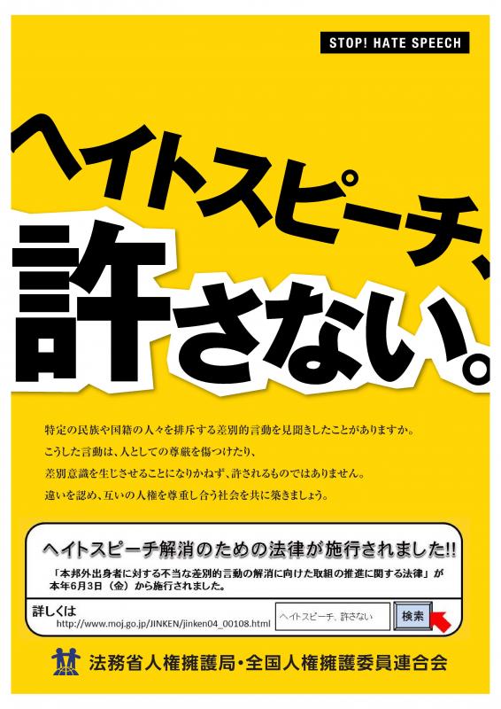 ホーム > くらし・環境 > 人権・男女共同参画 > 人権教育・啓発 > その他の人権課題の啓発等 > 「本邦外出身者に対する不当な差別的言動の解消に向けた取組の推進に関する法律」が施行されました