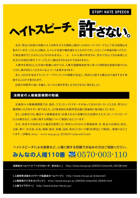 近年,特定の民族や国籍の人々を排斥する差別的言動がいわゆるヘイトスピーチであるとして社会的関心を集めています。こうした言動は,人々に不快感や嫌悪感を与えるだけでなく,人としての尊厳を傷つけたり,差別意識を生じさせることになりかねません。一人一人の人権が尊重され,豊かで安心できる成熟した社会の実現を目指す上で,こうした言動は許されるものではありません。
