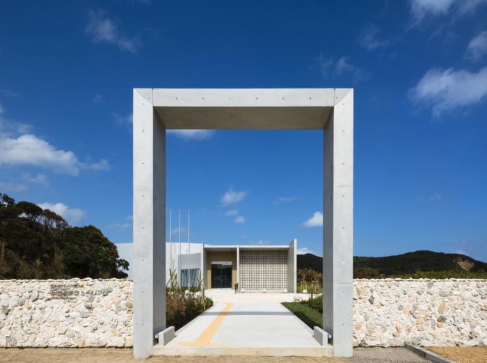 | 講評 | 象徴的な門とそれに連結するサンゴの低い石垣,奥に見える本体の薄いコンクリート屋根と壁は,都会の軽やかさを感じさせるデザインである。また,「結界の壁」,前庭空間,エントランス空間へと続く物語性の高い空間構成やシンプルなデザインは,モニュメントとしてインパクトが強く,際立っている。 幾何学的な造形と,これと対比的な豊かな島の自然と遺跡群が,地域の空間的魅力を高めるとともに,地域のシンボルとなっており,今後,ミュージアムと一体的に整備された「国史跡広田遺跡公園」とともに,古代と宇宙のロマンが繋がり膨らむパワースポットとして,ひと・まち・地域に夢と活力を与えることが期待される。 |