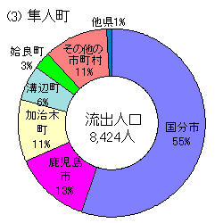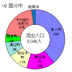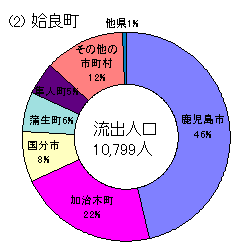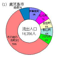 市町村で流出人口が多い市町村は,鹿児島市(16,356),姶良町(10,799),隼人町(8,424),国分市(6,046)などであるが,このうち,鹿児島市からは伊集院町へ1,449人,松元町へ1,167人,吉田町へ1,056人,郡山町へ1,015が流出しており,この4町で鹿児島市の流出人口全体の約3割を占めている。