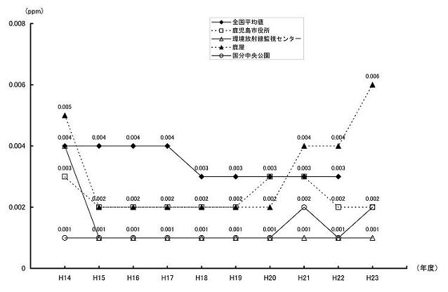 本県における平成23年度の大気汚染常時監視結果については,二酸化硫黄や浮遊粒子状物質,光化学オキシダントで,それぞれ桜島火山活動や黄砂,大陸からの移流等の要因によって環境基準を達成できなかった測定局があったものの,二酸化窒素及び一酸化炭素では環境基準を下回っており,全体としては,これまでと同様,良好な状況でした。