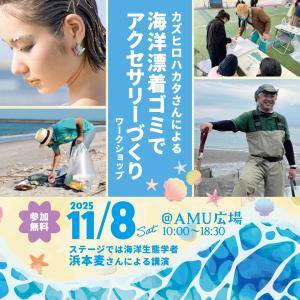 AMU広場でFMかごしまが主催するイベント「君とAMUフェス!!!」にて,くすの木自然館浜本麦さんによるステージでのトークショーや情熱家ハカタカズヒロさんによる海洋プラスチックごみを使ったアクセサリー作りなどを体験できるブースの出展を行います。