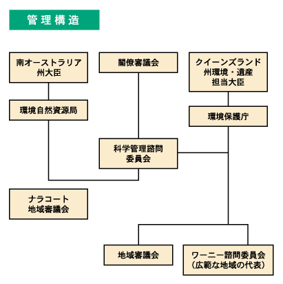 - 自治体による遺産地域の管理地方自治体は、グレートバリアリーフの管理に直接の役割を持たない。しかし、地方自治体は、ゾーニング計画及び管理計画立案における主な利害関係者であり、計画策定の上で大きな影響力を持つと思われる。さらに、グレートバリアリーフ全域に及ぶ海岸部の開発を規制する諸計画(例えば戦略案、市街地計画、開発規制計画など)の立案を通じて、地方自治体は、グレートバリアリーフ海洋公園の各区が保有する価値の保存に影響力を持つと見られる。