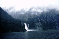 - ミルフォード・サウンド(MilfordSound)のスターリング滝。湿度の高い日に、ニュージーランドで最も名高いフィヨルドの岩壁をこの滝が幾重にも分かれ流れて行く様は絶景である。