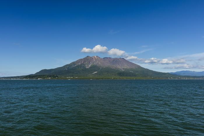 錦江湾に浮かぶ活火山。1日に7回姿を変えるといわれ、勇壮で秀麗な姿を持つ鹿児島のシンボル。標高1,117m、周囲52km。