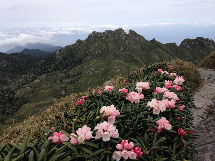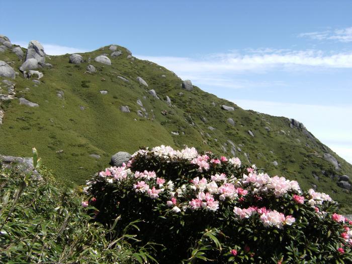 南東面はヤクザサに覆われ、初夏にはヤクシマシャクナゲなどが美しい花を咲かせ、登山客の目を楽しませる。