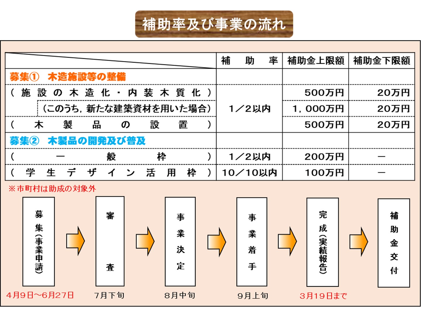 本事業では,県産材の積極的な活用により,多くの人たちが木の良さを実感できる「木造施設等の整備」や,県産材の利用拡大が期待できる「木製品の開発及び普及」に関する取組を県民の皆様から広く募集し,助成を行うこととしています。