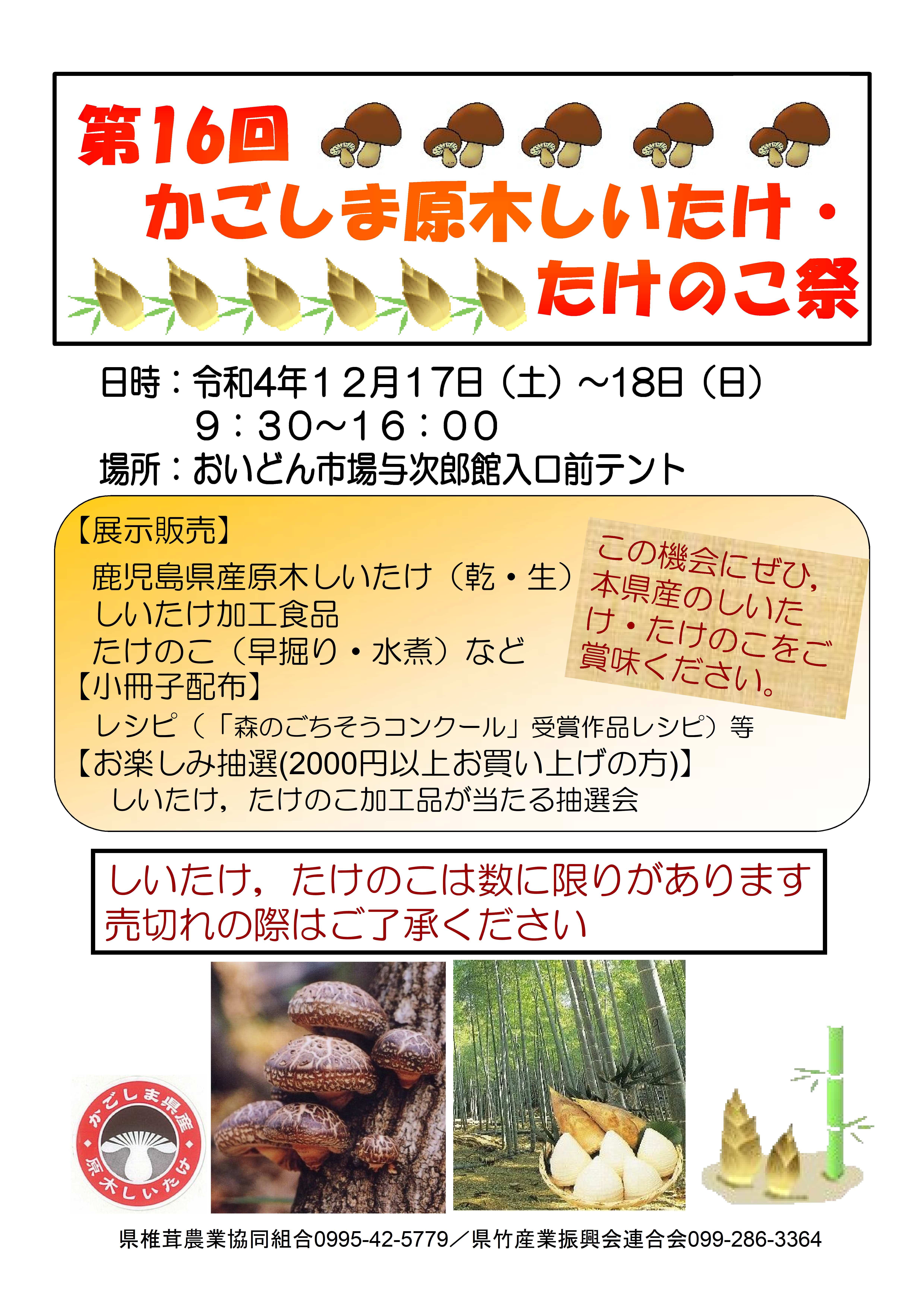 ホーム > 産業・労働 > 林業・水産業 > 特用林産物 > イベント紹介 > 第19回かごしま原木しいたけ・たけのこ祭(終了しました)