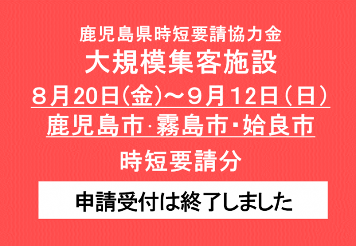 申請受付は終了しました<【要請期間:8月20日から9月12日(鹿児島市・霧島市・姶良市)】大規模集客施設に対する時短要請協力金の申請書類はこちら
