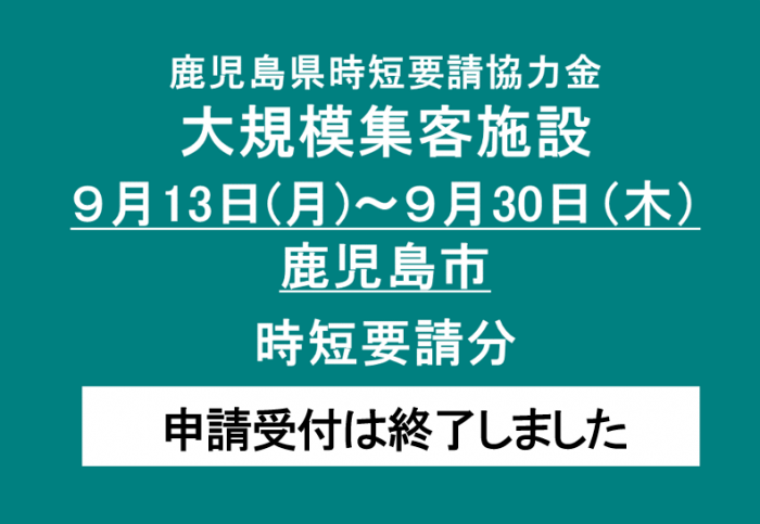 申請受付は終了しました<【要請期間:9月13日から9月30日(鹿児島市)】大規模集客施設に対する時短要請協力金の申請書類はこちら