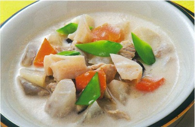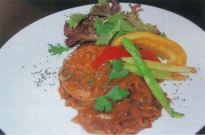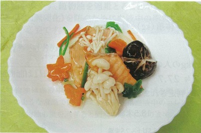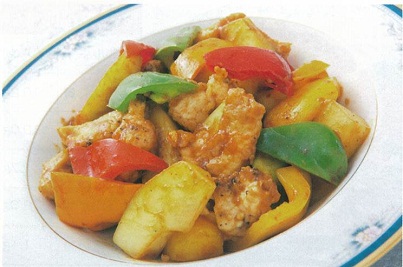 酢豚,酢鶏は一般的には素揚げするので脂質が多くなっています。鶏肉は焼き,野菜は茹でることで脂質をかなり控えられます。甘酢にはトマトケチャップを入れて甘みを出し,食塩を少なめにすることにも効果的です。色とりどりの野菜をたっぷり使用し,見た目も鮮やかなメニューになっています。