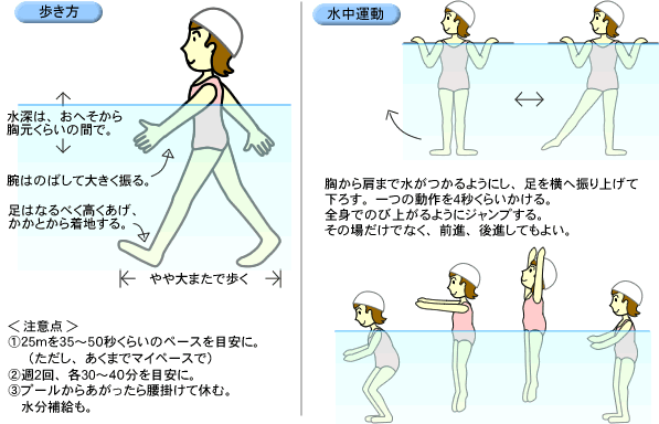 水中運動は、浮力や水抵抗がかかるため、全身の筋力を比較的楽にかつ安全に鍛えることができ、また、膝や腰への負担が軽減される運動です。