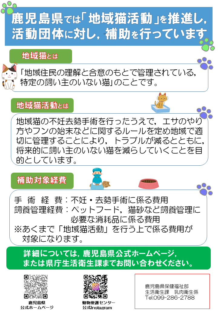 鹿児島県では地域猫活動等に要する経費の一部を助成します。
