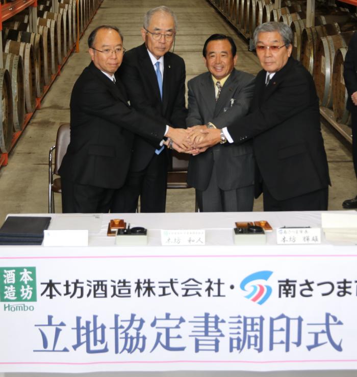 本坊和人代表取締役社長(中央左),本坊南さつま市長(中央右),室屋南さつま市議会議長(右)