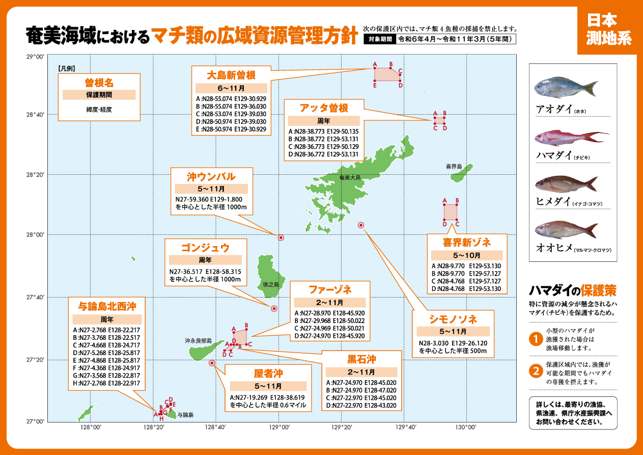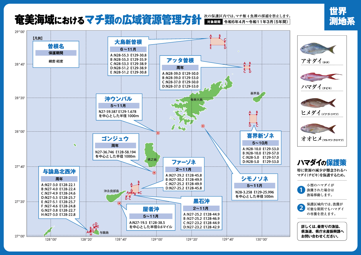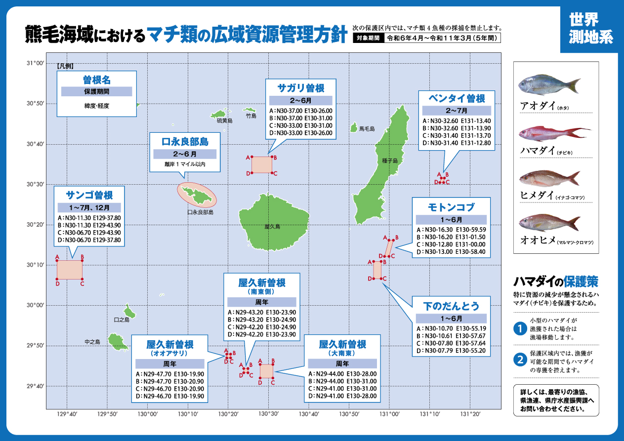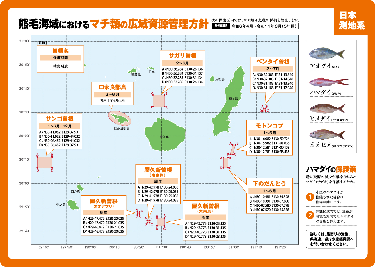 本方針は鹿児島県から沖縄県海域のマチ類(アオダイ、ハマダイ,ヒメダイ、オオヒメの4魚種)資源を対象としており,関係漁業者が設定した保護区や保護期間の設定,小型魚保護等の資源管理措置が記載されています。