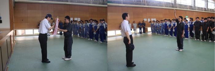 開会式では、昨年度団体優勝した先輩達に代わり、建築工学科2年生の中村君(出水工業高卒)が優勝トロフィーを返還しました。選手宣誓は、建築工学科2年生の樋口君(鹿児島南高卒)が務め、「明日から始まる夏の甲子園出場をかけた鹿児島大会の高校球児に負けないパフォーマンスをここ宮之城の地で展開し、創立68年にふさわしいレベルの高い大会にします」と、元高校球児らしい力強い宣言を行いました。