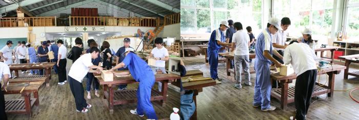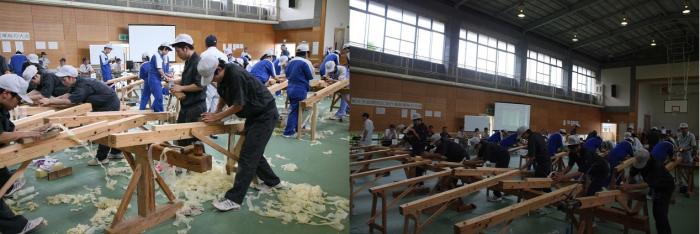 梅雨の晴れ間が広がり各地で真夏日となった7月1日、開校記念行事として毎年恒例の鉋(かんな)薄削り大会が開催されました。