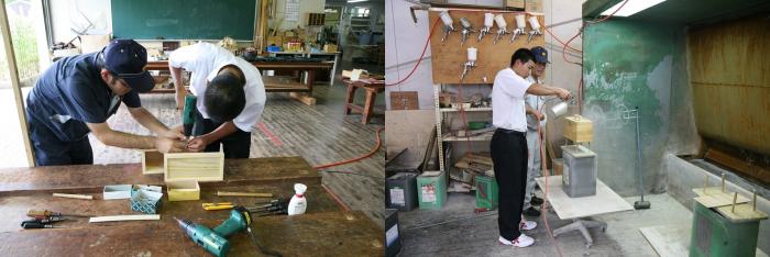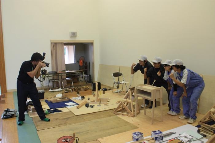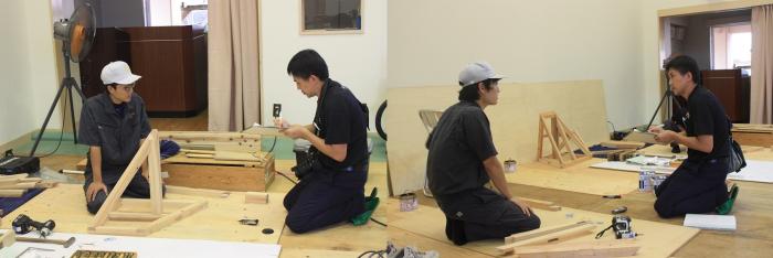 はじめに、専門校の内容を知っていただくため、紹介用のスライドや映像を視聴していただきました。その後、ものづくり体験として室内造形科では「CDボックス」を、建築工学科では「読書いす」を製作しました。参加された皆さんは、暑さや時間を忘れて、ものづくりに没頭していました。わずか3時間で2作品を完成させた参加者の表情は達成感に満ち溢れ、満足げに作品を持ち帰る姿が印象的でした。暑い中本当にお疲れさまでした。