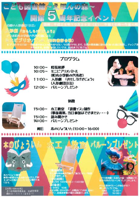 10月29日(土曜日)に,さつま町で開催される「こども図書館~えほんの森~開館5周年記念イベント」に建築工学科2年生が技術協力します。事前に申込みのあった小・中学生30名を対象に、訓練生が「読書イス」制作のお手伝いをします。詳しくは、下記ポスターをご覧ください。