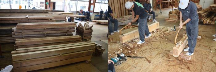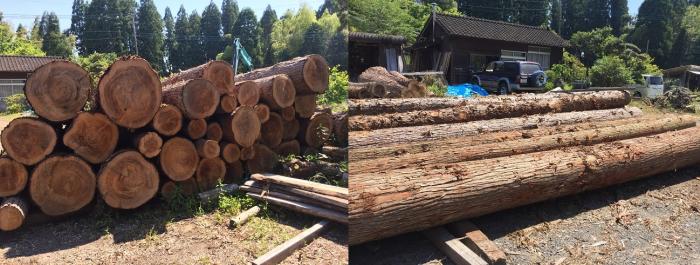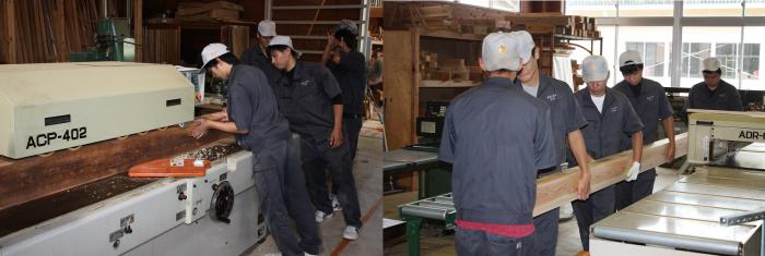 黙々と運ぶ訓練生が頼もしく見えます。運びこまれた材木は、秋頃まで乾燥させます。