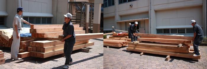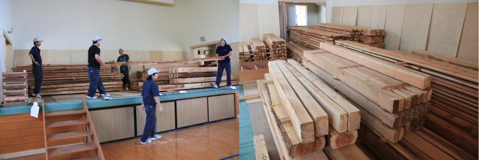 地域の山林から切りだされ天然乾燥していた丸太が、角材、板材、割材などに製材され、専門校に搬入されました。その量、トラック6台分!