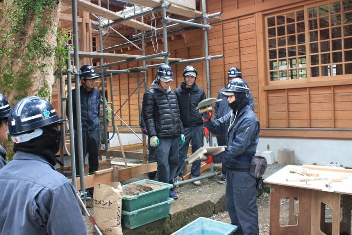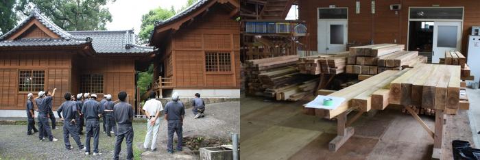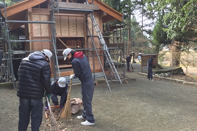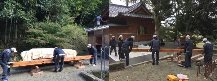 この神社には、平成19年から21年にかけて、総勢62名の本校訓練生が改築工事に携わりました。当時、その活動が評価され鹿児島ロータリークラブから青少年功績賞を贈られています。あれから10年が経ち、大祭や初詣の参拝者も増えたため、社務所を建設することになり、過去の”えにし”から今回も本校に白羽の矢が立ったものです。