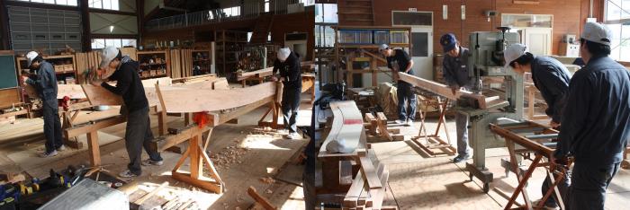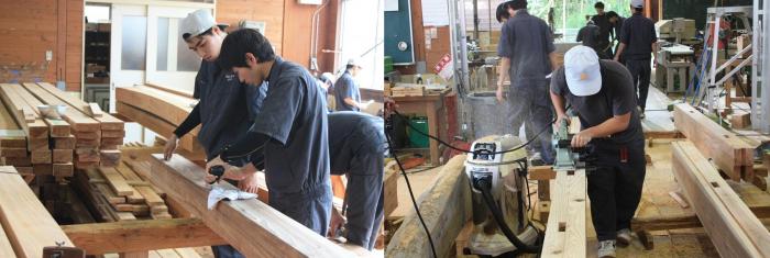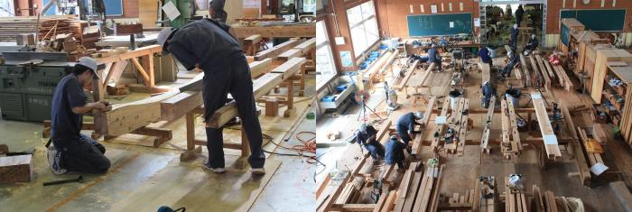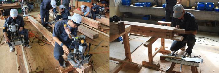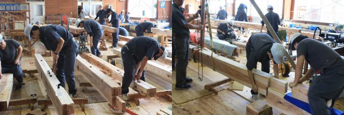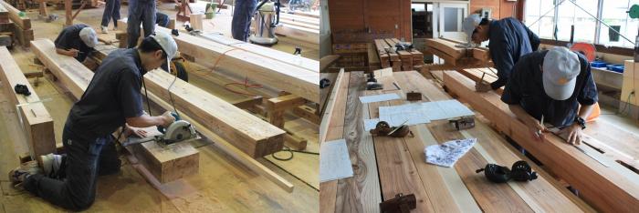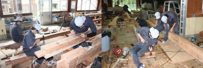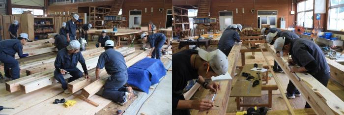 訓練生は、木ごしらえや墨付け、加工に奮闘しています。慣れない電動工具や無垢の木材に神経をすり減らし、5寸柱や規格外の桁梁に体力を奪われ、訓練生も少々お疲れ気味です。朝礼後、実習をスタートさせると、あっという間に夕方に・・・気がつけば2週間が経過!工程表に追われながら、まさに"光陰矢の如し”仮組みまでもうひと踏ん張り、安全第一で頑張りましょう!
