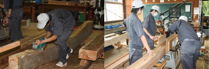 乾燥させた材木を実習場に運び入れ、手始めに皮付きの材料を釿(ちょうな)で斫(はつ)る作業から!