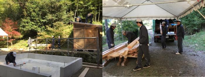 基礎工事が完了した現場に、鉋仕上げや塗装仕上げを施した材料を搬入しました。現場倉庫や足場を設置し、いよいよ現場での施工実習が始まります。環境の整った校内での実習と違い、限られた条件の中で状況判断や決断力が求められ、より実践的な訓練となります!