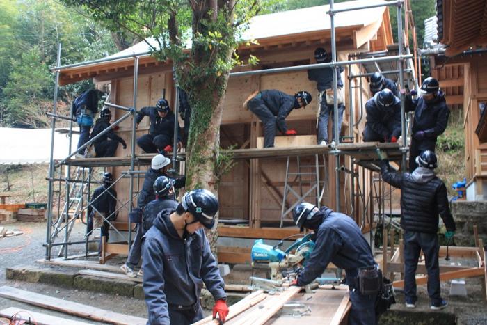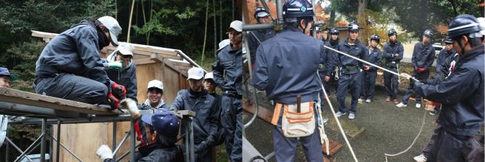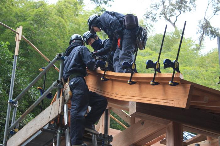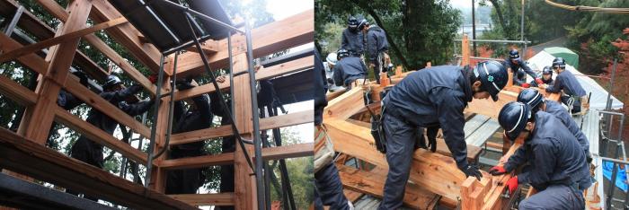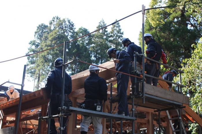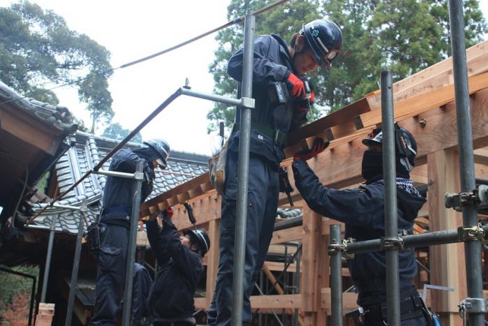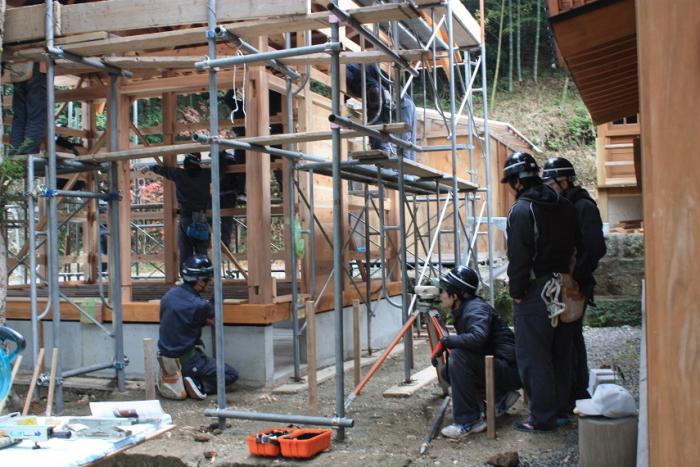 安全第一で作業するため、訓練生は手始めに番線の締め方やロープの結び方などのレクチャーを受け、足場設置に取り掛かりました。今回の現場は、枠組足場に単管本足場や一側足場などを組み合わせ、クレーン車を使わずに昔ながらの人力作業で棟上げを行いました。訓練生は慣れない高所での作業にも臆することなく、手刻みの現場らしい木組みを叩き込む掛矢(木槌)の音を境内に鳴り響かせていました。上棟後、記念写真に収まる訓練生のうれしそうな姿が印象的でした。後日、大安吉日に工事安全と建物の堅固長久を祈念する上棟祭がしめやかに執り行われました!