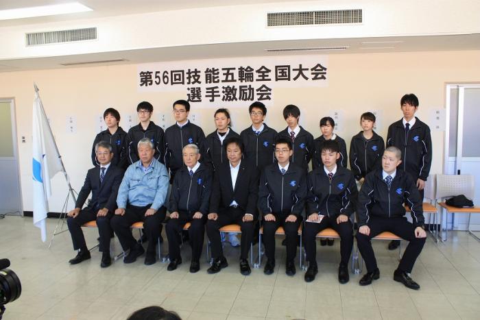 第56回技能五輪全国大会に出場する県代表選手の激励会が県青少年会館で行われました。全国大会は11月2日から5日まで沖縄県で開催され、23歳以下の青年技能者が42職種で技能日本一を競います。本県からは7職種(メカトロ、電子機械組立て、左官、家具、建築大工、洋裁、日本料理)に12名が出場します。式では、選手団が紹介された後、県商工労働水産次長から本坊団長へシンボルマーク旗が手渡され、激励の言葉をいただきました。また、選手には各団体から激励金が授与されました。最後に、選手を代表して岩重選手(日本料理職種)が大会への決意を述べ、記念撮影となりました。