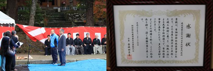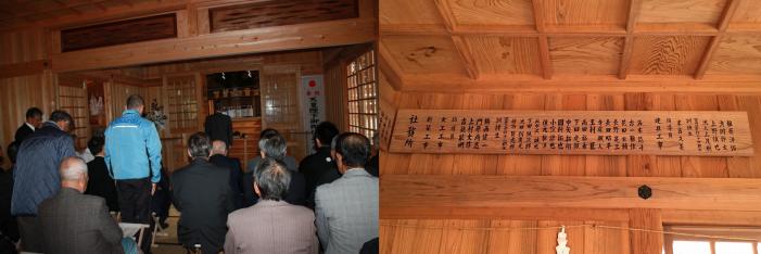 今回、御社殿完成を記念して、拝殿内の板壁に改築工事に携わった総勢91名の訓練生と職員の名前が記されました。思い返せば11年前、「平成の大改築」と銘打って地域の有志が立ち上がり、専門校にその想いが託されました。建物は朽ち果て、廃れていた神社の境内が、今では人々が集い、憩う場となりました。専門校として地域コミュニティ活性化の一翼を担えたことを、改めてうれしく思う一日でした。