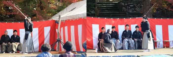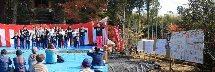また、長年にわたり改築事業に貢献した功績が称えられ、本校に感謝状と記念品が贈呈されました。更に改築工事の過程で、社務所の前に鎮座するユスノキが、薩摩独特の剣術「示現流」の木刀に使われている由緒ある木であることが判明。そのご縁で、東郷宗家子孫による示現流兵法が奉納され「立木打ち」や「小太刀」など、八つの型が披露されました。その他、日本舞踊や地元踊り、キッズダンスなどが披露されました。紅葉した境内には俳句や図画などの児童たちの作品が並び、来場者には豚汁やおにぎりが振る舞われ、大いに賑わっていました!