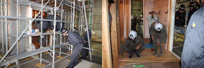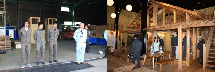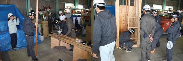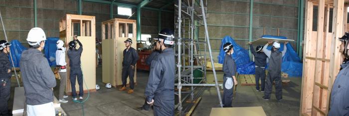 住宅メーカーの人事担当者から、修了生3名が実習用の実物大模型を製作したので見に来てほしいという連絡を受け、急きょ建築工学科1年生17名を引き連れて会社訪問しました。訓練生は、こだわりの家づくりや施工法について説明を受けた後、修了生の床張り作業を食い入るように見ていました。また、先方の計らいでビス打ち機によるボード張りと丸鋸を使った壁下地の取り付けを体験させていただきました。電動工具に不慣れな1年生も、初めは緊張した様子でしたが、修了生の手ほどきを受けながら、最後は慣れた様子で施工していました。修了生達のたくましく成長している姿に、会社を挙げて育てていただいている様子が伝わってきて、我々もうれしく思いました。社員の皆様,貴重な時間を割いていただき,ありがとうございました。
