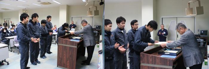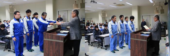 第2過程の終業式に合わせ、11月中旬に開催された校内技能競技大会の表彰式が行われました。県職業能力開発協会から表彰された上位入賞者に、宮本校長から賞状や盾が手渡されました。審査結果は以下のとおりです。入賞した皆さん、おめでとうございます!