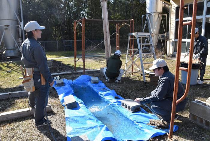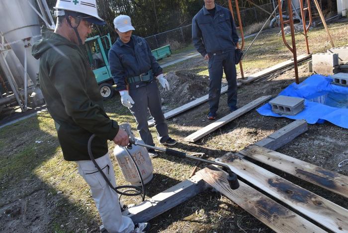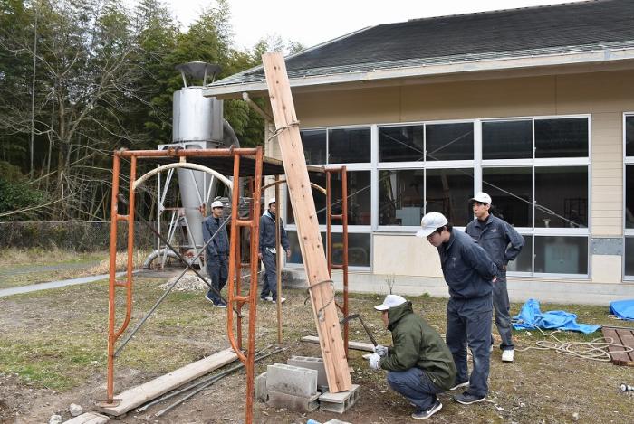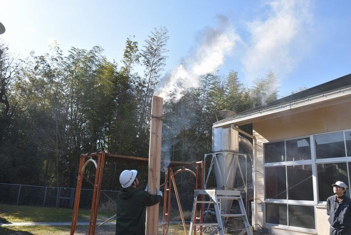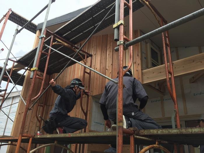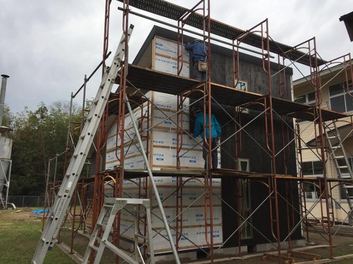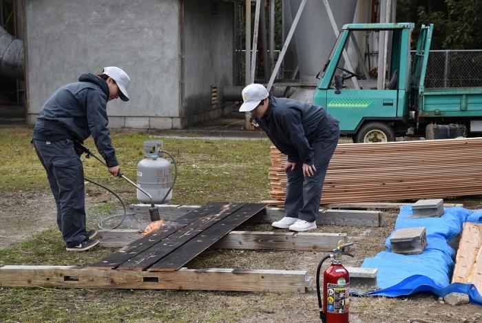 (写真は内外装工事に奮闘している様子です。にわかに注目を集めている外壁材「焼杉(やきすぎ)」。煙突効果を利用した伝統的な「三角焼き」にも挑戦しました!)