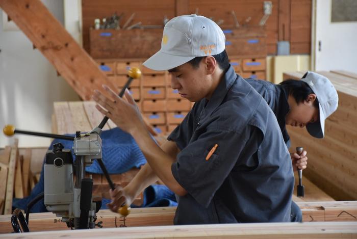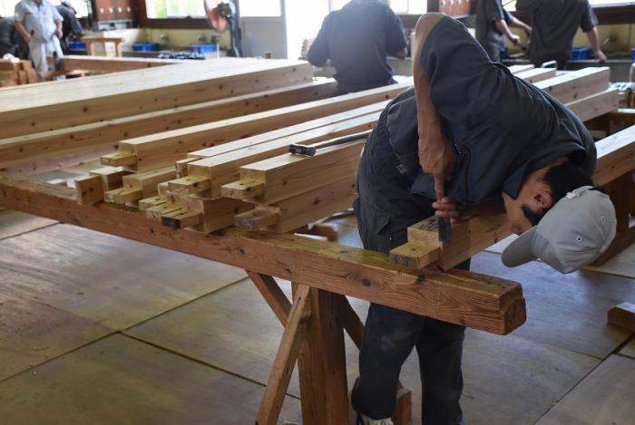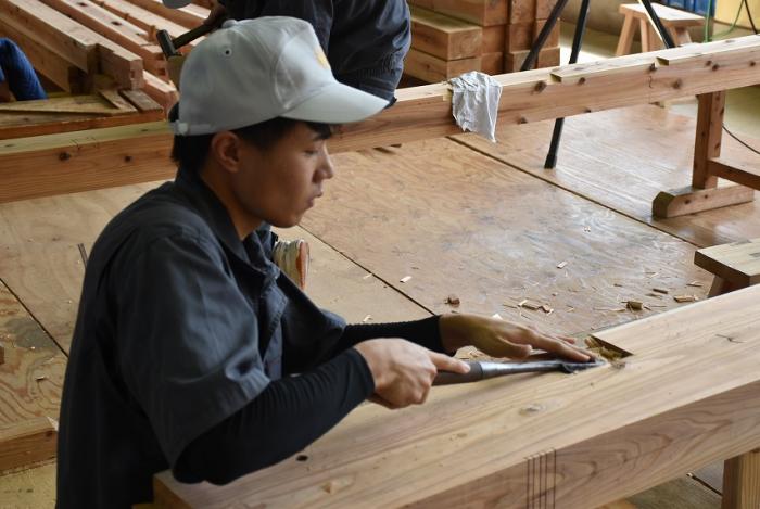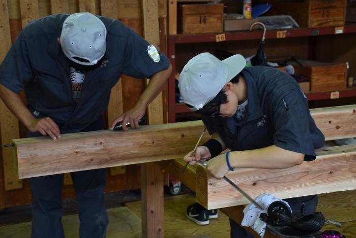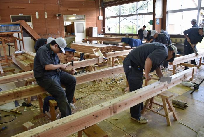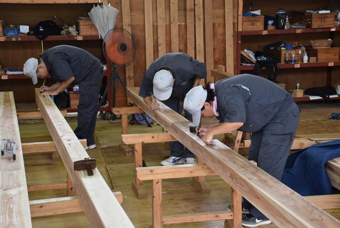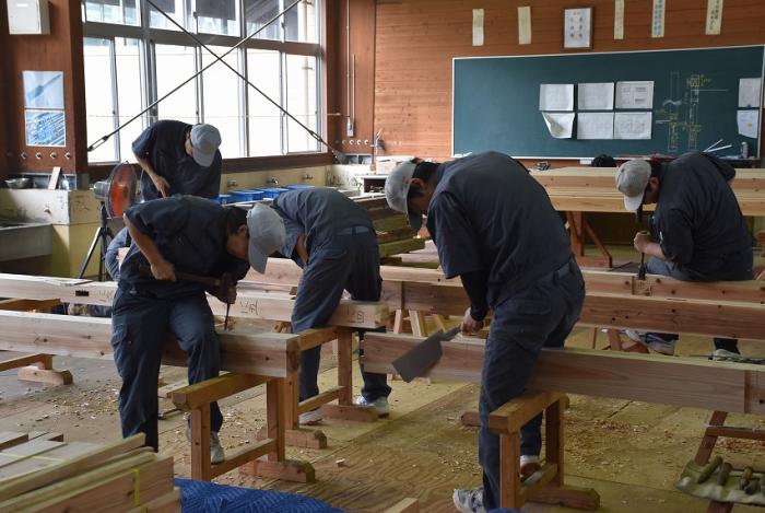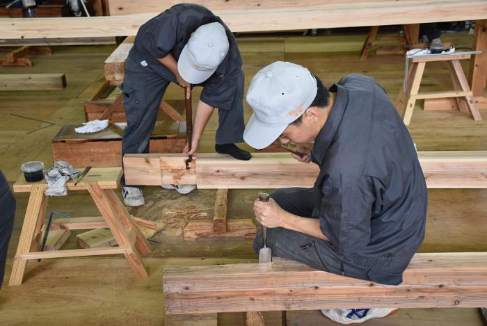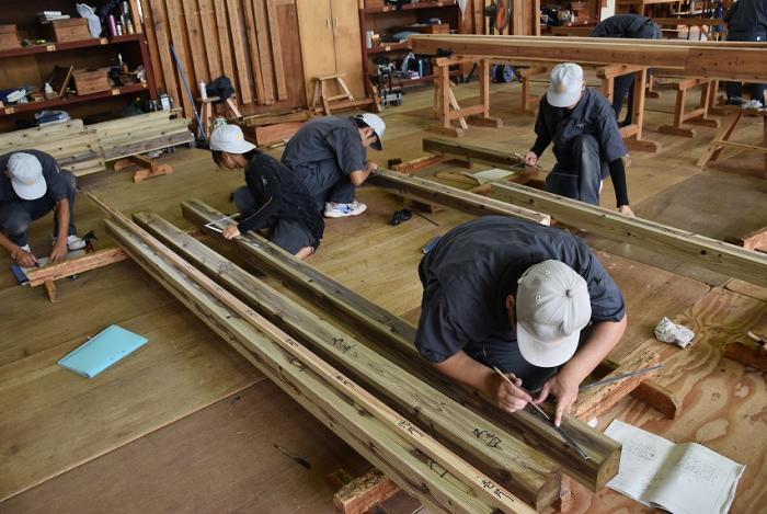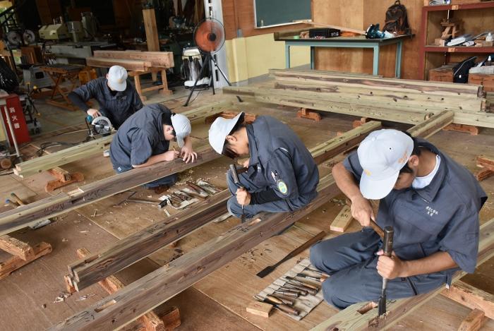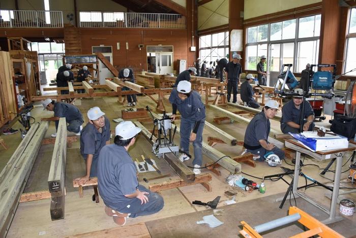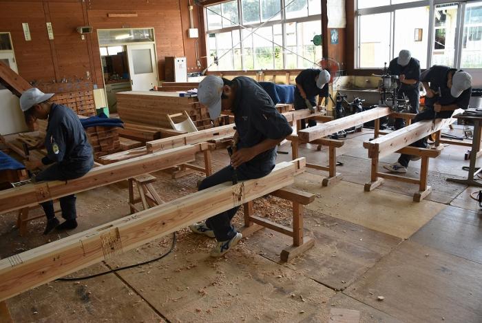 今回,関係団体のご厚意でかごしま型「木造応急仮設住宅」の構造躯体モデルを手刻み加工することになりました。残暑が厳しい中,建築工学科2年生は安全第一,工期厳守,品質保証を遂行するため全力で挑んでいます。災害は起こらないにこしたことはありませんが,訓練生には日頃から地域や社会に貢献する意識を持ち,将来,災害復興現場で活躍できる人材になってくれることを期待しています。この躯体モデルは「2019住まいと建築展(開催日時:10月18~20日,会場:県民交流センター)」で展示される予定です。ご期待ください!