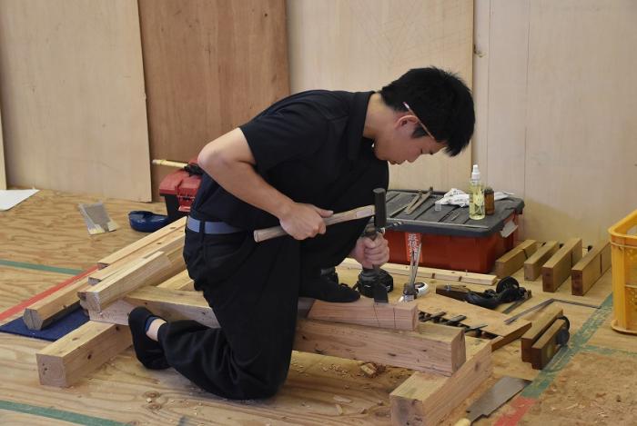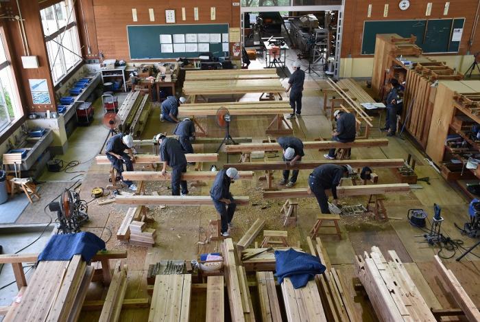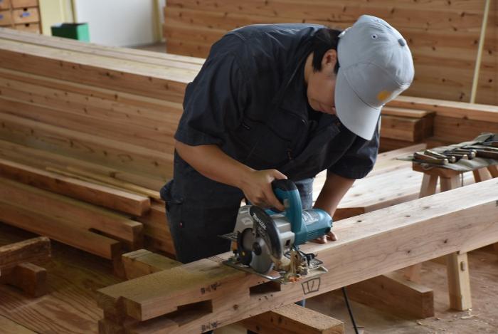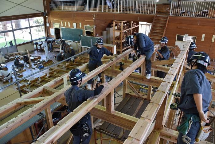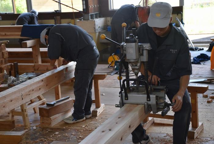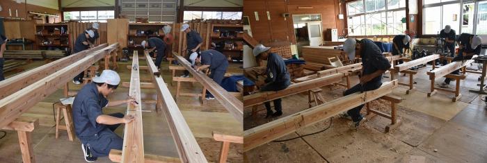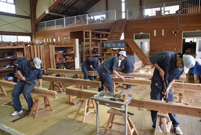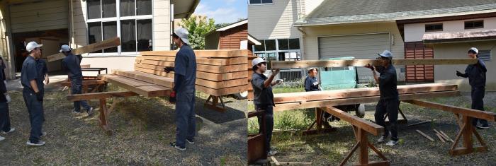 今回,関係団体のご厚意でかごしま型「木造応急仮設住宅」の構造躯体モデルを手刻み加工することになりました。残暑が厳しい中,建築工学科2年生は安全第一,工期厳守,品質保証を遂行するため全力で挑んでいます。災害は起こらないにこしたことはありませんが,訓練生には日頃から地域や社会に貢献する意識を持ち,将来,災害復興現場で活躍できる人材になってくれることを期待しています。この躯体モデルは「2019住まいと建築展(開催日時:10月18~20日,会場:県民交流センター)」で展示される予定です。ご期待ください!