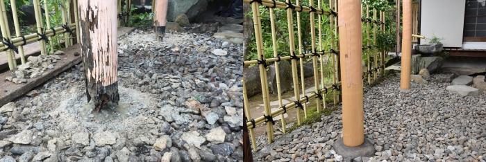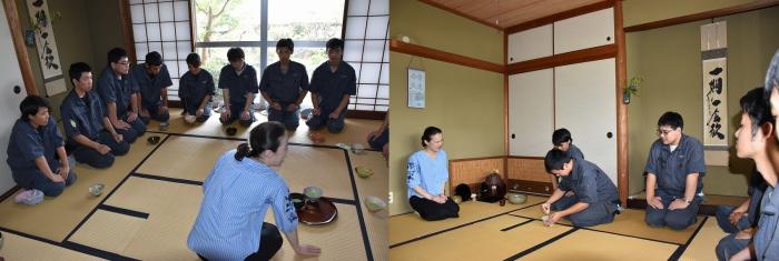 夏季休暇を前に,建築工学科2年生15名が茶室を補修する難工事に挑みました!土庇(どびさし)の腐った柱部分を取り除き,新しい材料で継ぎ足す伝統の根継ぎ作業。材料は茶室や数寄屋に重宝される京都の銘木「北山杉」を使用。事前の現地調査で,モルタルに覆われた既存の柱3本が根腐れし,空洞化していることが判明!台風や地震の発生に備え,工事は急を要しました。まずは建物を補強して,倒壊を防ぎながら,既存柱の保護と腐食部分の撤去に着手。その後,近所の裏山杉の丸太で継ぎ手を試作し,金物や礎石との納まりを検証。最後は,川内川から調達した礎石の石型を柱の断面に写し,金物で緊結。残念ながら天候に恵まれず,連日避難指示レベルの大雨に見舞われながらも,各班のリーダーを中心に万全を期して臨んだ今回の工事…その出来栄えに施主や依頼者も満足の様子でした。引き渡し後,施主からお点前を頂戴し,茶道のお作法と和の心を学びました。また、工事期間中は近隣の川内商工高校の先生方や生徒たちが見学に訪れ,成長した卒業生の仕事ぶりに見入っておられました。