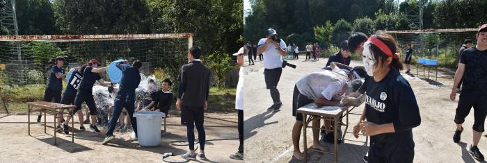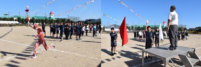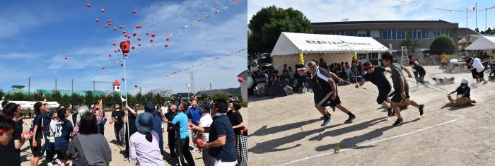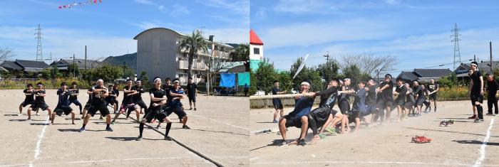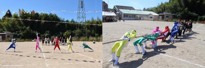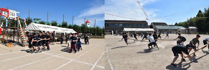 秋晴れの下,コスモスが咲き誇る校庭で恒例の大運動会が盛大に執り行われました。昨年は,運動会の様子が人気番組『てゲてゲ』の「白熱!ユニーク体育祭」で紹介され,放送後に多くの反響がありました。その影響もあってか,今年は保護者テントに収まらないほどの観客が詰めかけました。紅白に分かれての学年対抗戦は,互いに意地と意地がぶつかり合う白熱した展開となりましたが,結果は1年生の白組が勝利!ラグビーワールドカップ開催中ということもあり,白組15名及び職員1名が秘かに練習していた,ニュージーランド代表オールブラックスにふんしハカを披露!!その情報を前日に入手した赤組の職員が,急きょ,にわか仕込みのヒーローを投入!サプライズ登場に会場は湧きましたが,打合せなしの即興コントはグダグダに…。