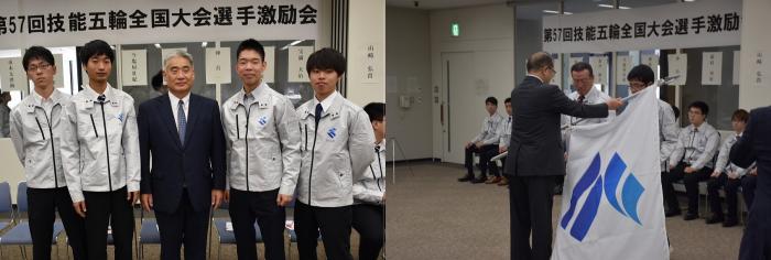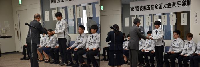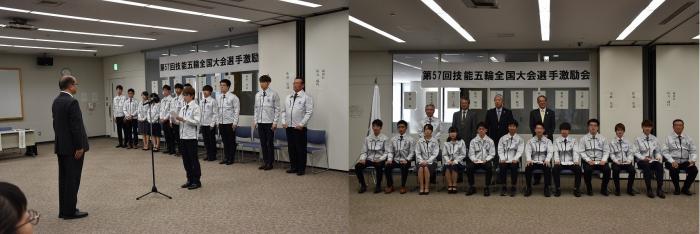 第57回技能五輪全国大会に出場する鹿児島県代表選手の激励会が県民交流センターで行われました。全国大会は11月15日から18日まで愛知県で開催され,23歳以下の青年技能者が42職種で技能日本一を競います。本県からは6職種(メカトロ、電子機械組立て,家具,建築大工,洋裁,日本料理)に11名が出場します。式では,選手団が紹介された後,県商工労働水産部長から団長へシンボルマーク旗が手渡され,激励の言葉をいただきました。また,選手には各団体から激励金が授与されました。最後に,選手代表が大会への決意を述べ,記念撮影となりました。