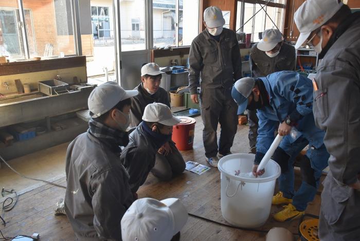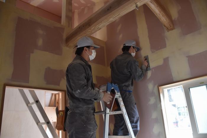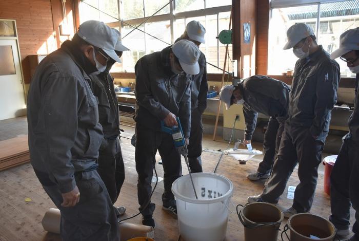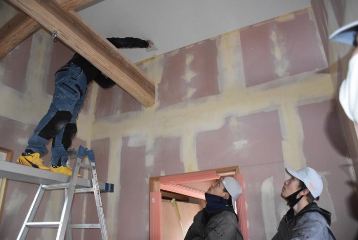 訓練生は、パテ処理やクロス貼りを経験し、壁下地やボード張りの工程がいかに大切かを学んだようです。日程的にボリュームのある内容でしたが、外部講師の先生には昨年度の事情を汲んでいただき、モデルハウスの完成にご尽力いただきました。年度末のお忙しい中、引き受けていただきありがとうございました。