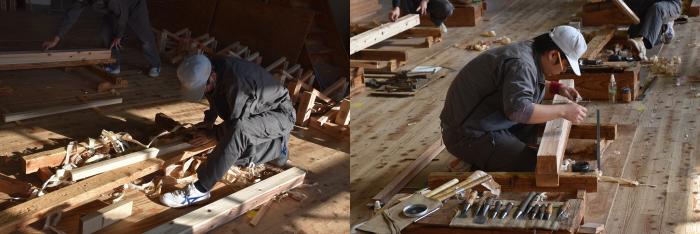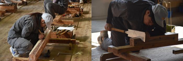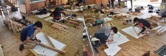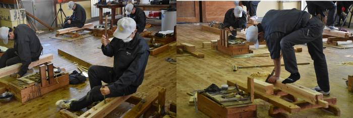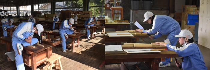 先日、建築大工1級技能検定受験者を対象に、2日間の試験対策講座を実施しました。当日は、修了生7名を含む9名が参加しました。普段の現場とは違う作業に最初はとまどいつつも、原寸図や墨付けをマスターするため、必死に学んでいました。