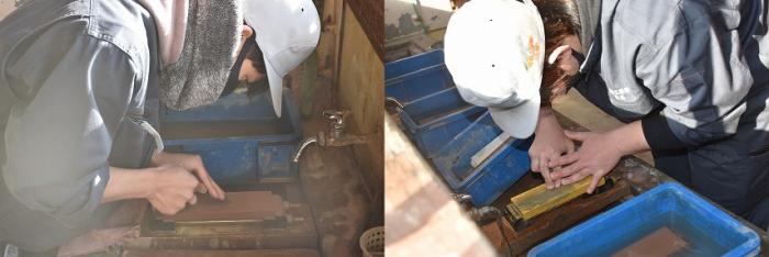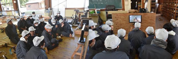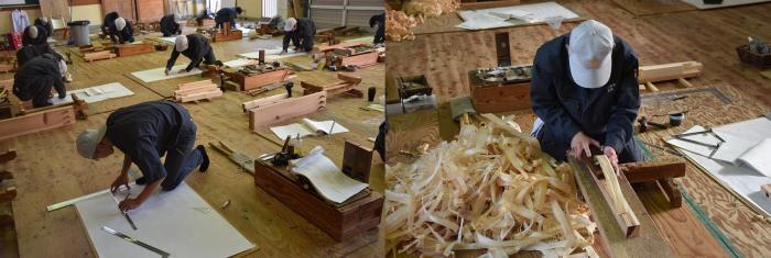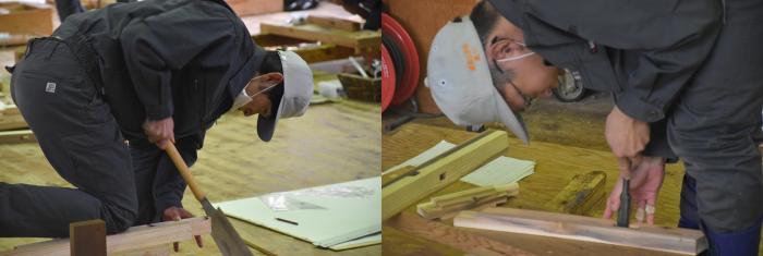 また,さつま町は周囲を山々に囲まれ,夏は蒸し暑く,冬は寒さが厳しい盆地特有の内陸的な気候です。紫尾(しび)山には冠雪や樹氷が見られ,平地においても積雪を観測します。連日冷え込みが強く,霜の降りる朝を迎えていますが,建築工学科では朝から冷水で刃物研ぎに勤しんでいます。この時期,訓練生は「しもやけ」と「あかぎれ」に悩まされながら,腕を磨いています!
