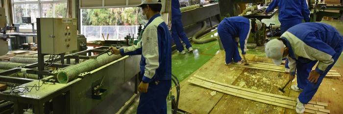 鹿児島県の竹林面積は全国一を誇ります。地元さつま町は県内有数の竹の産地として知られ,かぐや姫伝説が残る竹の町です。室内造形科では,この豊富な竹資源を活用した家具製品を製作しています。竹を活用した火鉢やなんこ台,花台は展示即売会でも売れ筋商品です。竹は環境に優しい自然素材であるとともに,丈夫で腐れにくく,使うほどに味わいが深まっていきます。寒さの厳しいこの時期,青竹から余分な水分や油分を除去する油抜き作業が恒例となっています。少量の苛性(かせい)ソーダを入れた熱湯の窯で竹を煮込んで油分を取ります。材料を作り上げるための大切な工程です。