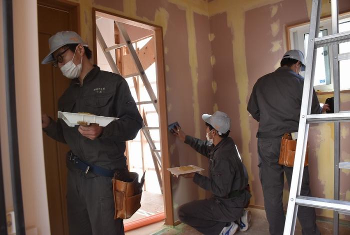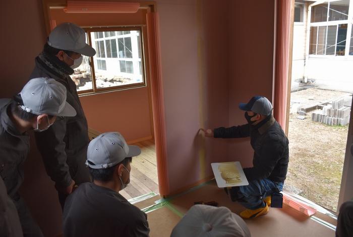 訓練生は、パテ処理やクロス貼りを経験し、壁下地やボード張りの工程がいかに大切かを学んだようです。日程的にボリュームのある内容でしたが、外部講師の先生には昨年度の事情を汲んでいただき、モデルハウスの完成にご尽力いただきました。年度末のお忙しい中、引き受けていただきありがとうございました。