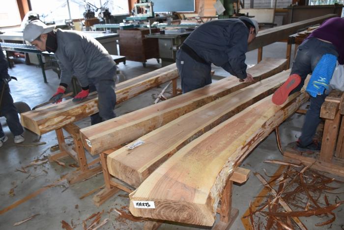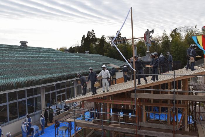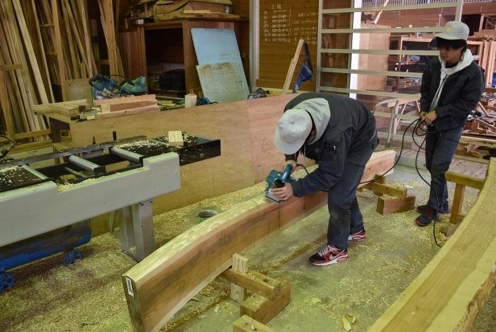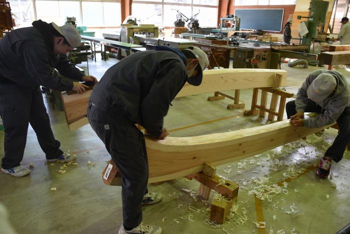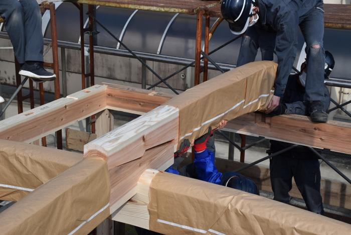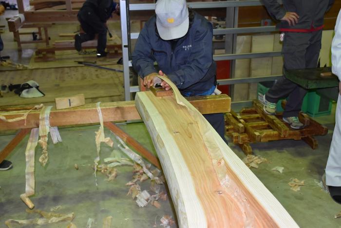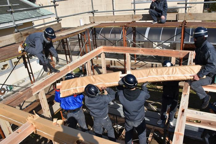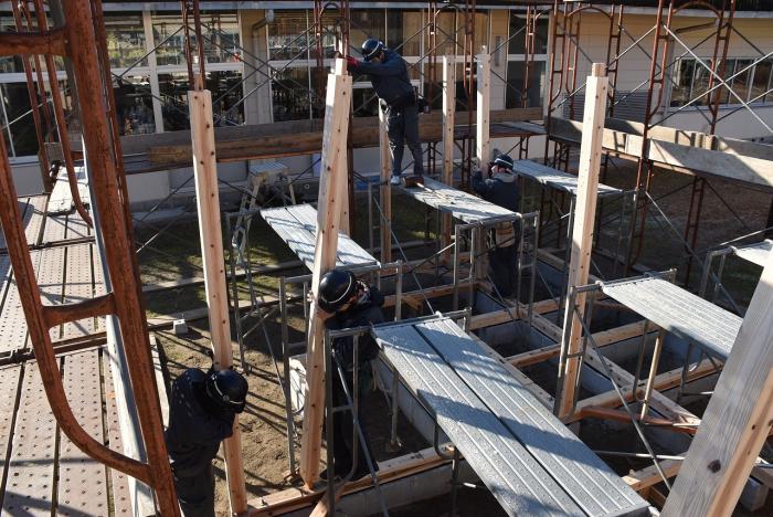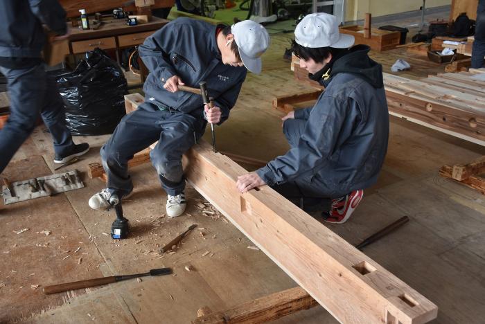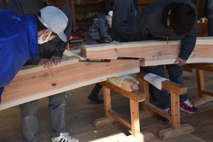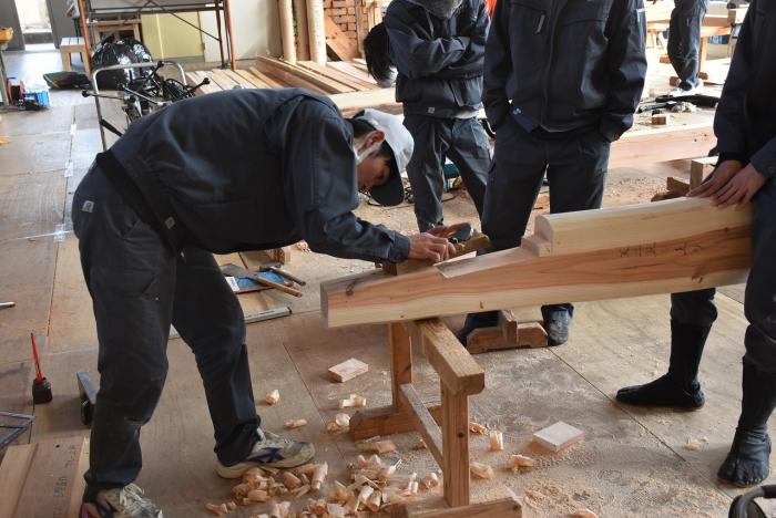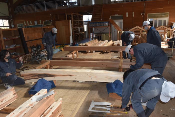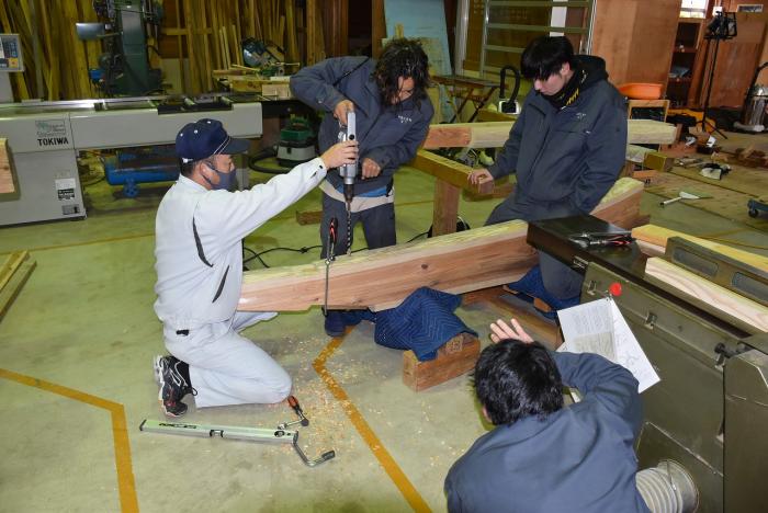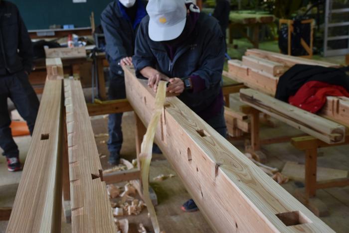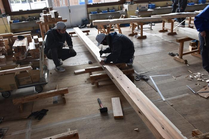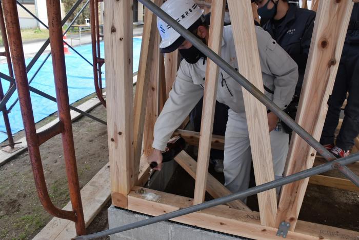 新型コロナの訓練への影響はさまざまなところで起きています。昨今の木材価格の急騰「ウッドショック」の背景には、コロナ禍に影響された需給バランスの崩壊という側面があります。欧州・北米産地での労働力不足による供給停滞や流通停滞。また、中国での需要増に加え、米国での巣ごもり需要や災害による住宅需要の急増など、国際的な需給バランスの急変により供給量が逼迫し、世界的に木材の価格が上昇しています。この輸入材の価格上昇のあおりを受け、2021年から国産杉も高騰。一立米あたりの販売価格が、一昨年からすると倍近くになっています。そのような状況の中で挑んだ修了製作。先日、無事に上棟を迎えましたが、予算の都合で、今年度は躯体工事で打ち止めとなりました。残りの仕上げ工事は、後輩たちが担います。